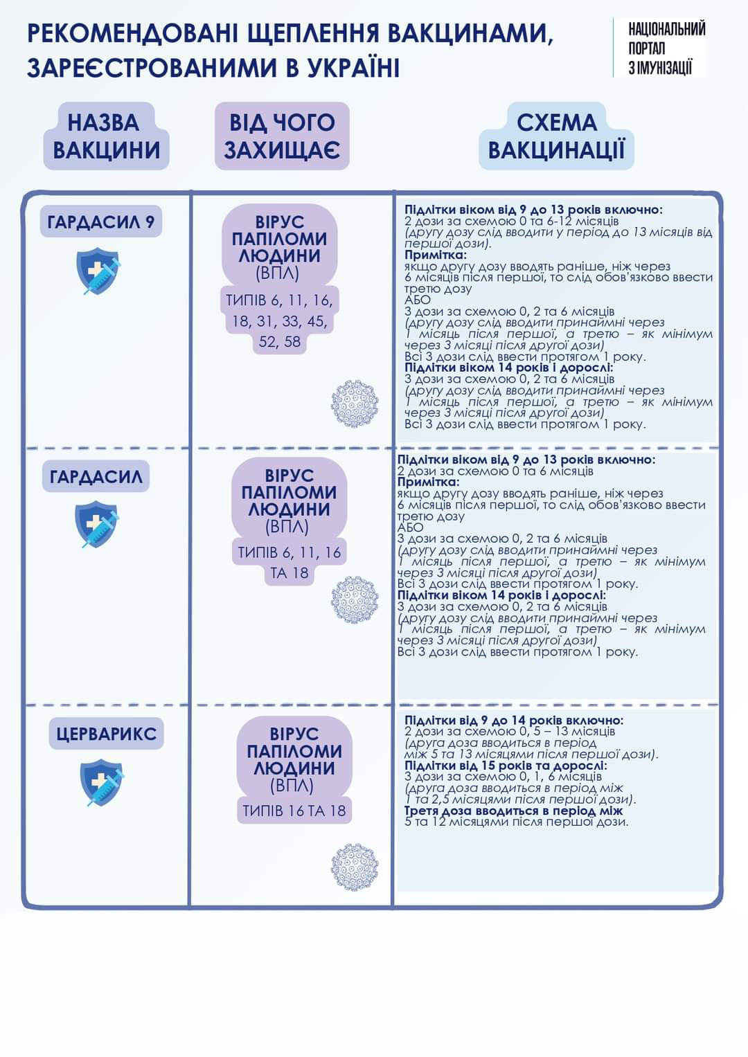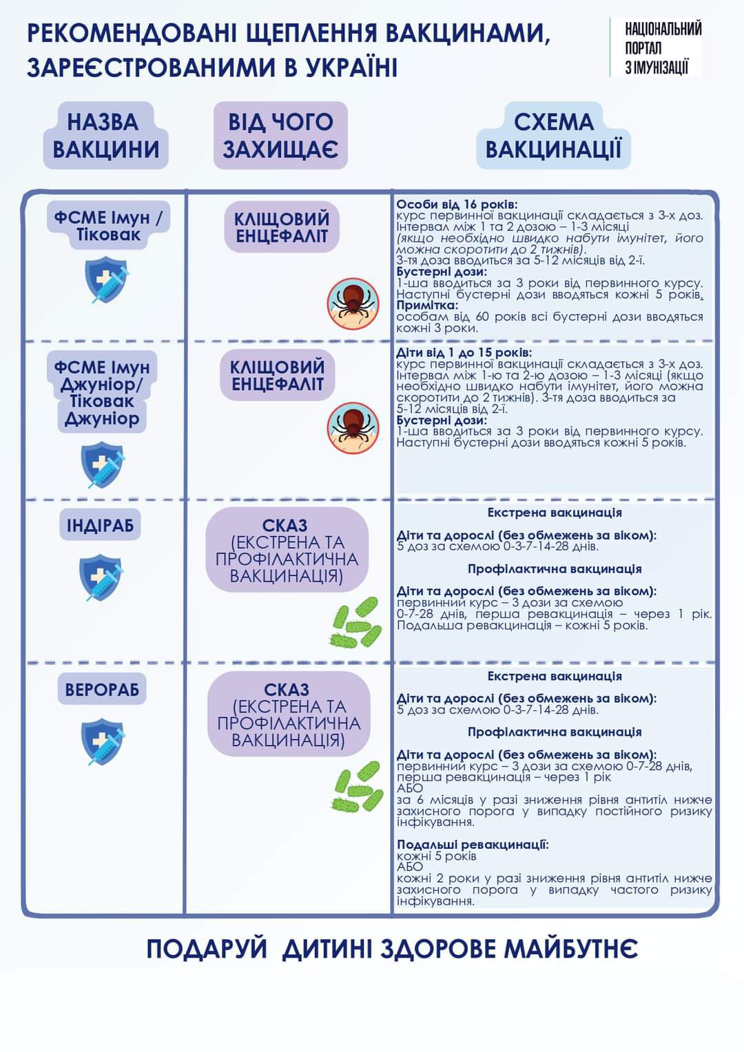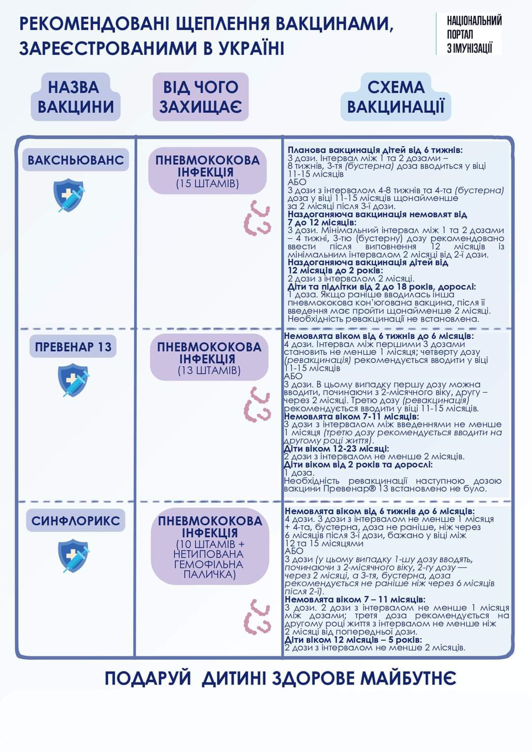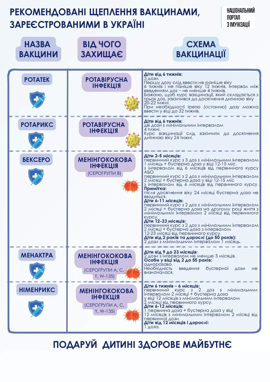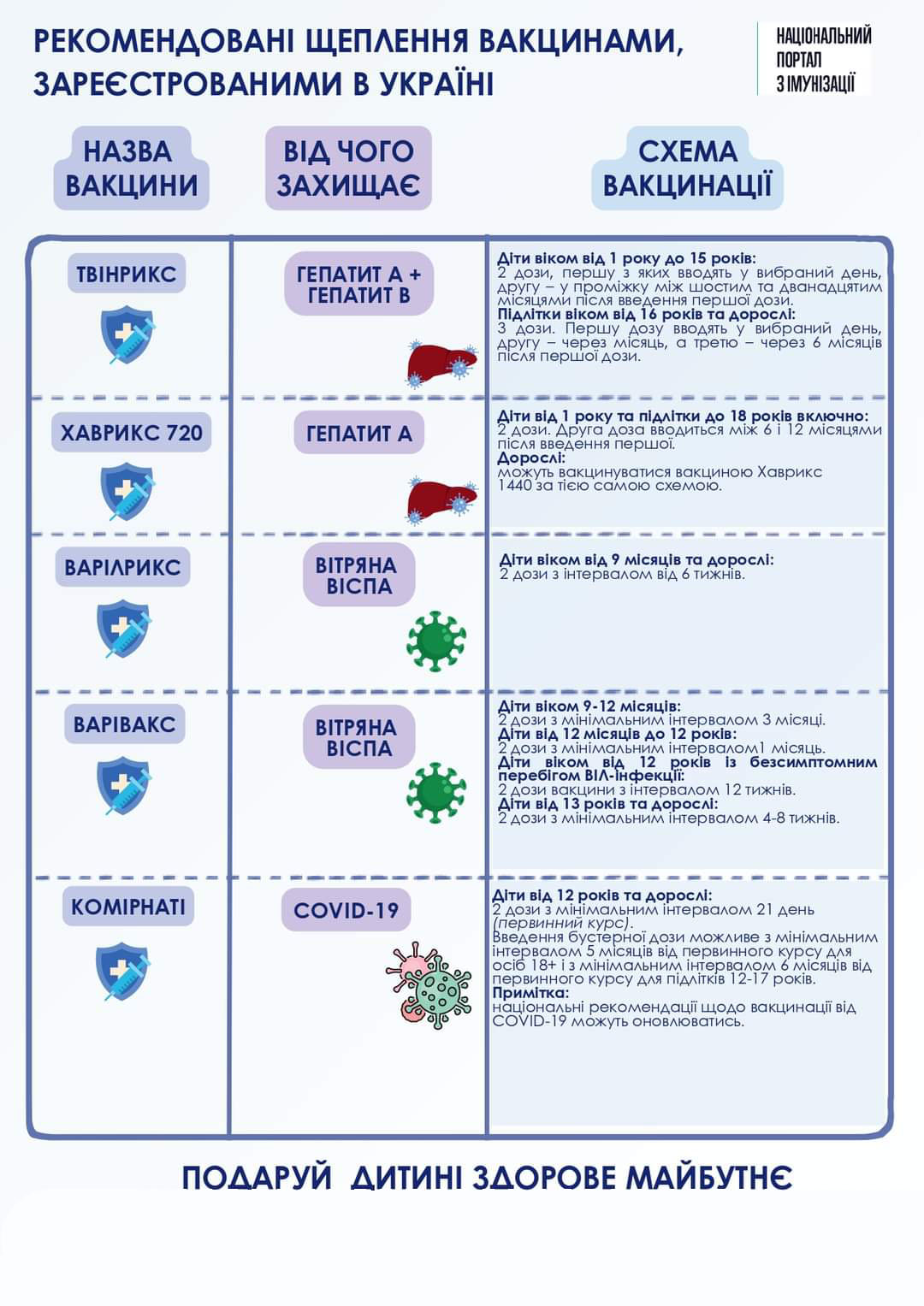 Національний портал з імунізації з метою підвищення обізнаності населення щодо національного календаря щеплень розробив наочні матеріали з назвами вакцин, та схемою вакцинації вакцинами зареєстрованими в Україні.